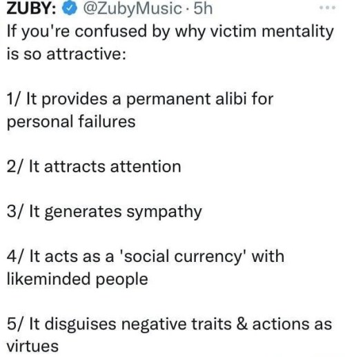 VICTIMS: Also, a chronic grievance mentality produces chronic anger, which generates lots of adrenaline. Adrenaline makes you feel good, while simultaneously blocking fear, anxiety, and depression.