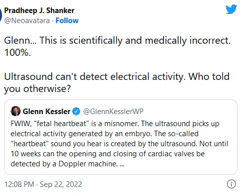 WaPo fake checker, Glenn Kessler, tweeted the clip out saying, “FWIW, “fetal heartbeat” is a misnomer. The ultrasound picks up electrical activity generated by an embryo. The so-called “heartbeat” sound you hear is created by the ultrasound. Not until 10 weeks can the opening and closing of cardiac valves be detected by a Doppler machine. …” Radiologist Pradheep J. Shanker responded: