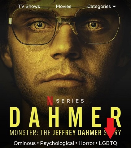LGBTQ: Some folks have their panties in a bunch over Netflix including their new series about Jeffrey Dahmer in the LGBTQ category. But the fact is that Jeffrey Dahmer was gay. They just don’t want him included in their club, because he was also a child predator who went to gay nightclubs, killed the men and boys he slept with, and then ate them.