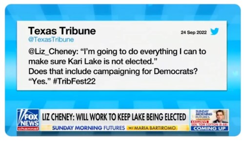 LIZ CHENEY: CLICK https://twitter.com/KariLakeWarRoom/status/1574105358615728128 [:42] to hear Kari say that opposition is the “biggest and best gift” Liz could give her. “The voters of Wyoming can’t stand her and I’m pretty much sure the people of Arizona don’t like Liz Cheney.”