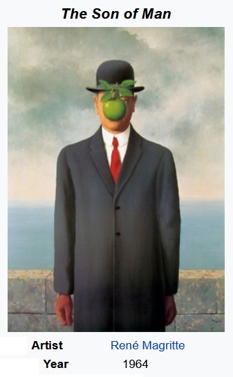 GRAMMY NOTES: Magritte said his most famous painting was about “the visible that is hidden and the visible that is present.” Me, I see an anti-christ. “Son of Man” is a biblical title for the Messiah, which I believe is what the Anti-Christ will claim himself to be. The man in the painting strikes me as a guy who has taken such a big bite of the Eden apple that he has totally subsumed the face God gave him. The super respectable dress, with right hand in sun, left in shadow, make me think of a con artist.