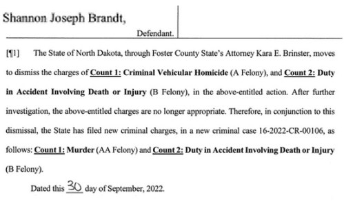 The Foster County State’s Attorney has upgraded its charges against Brandt to Murder (maximum penalty: life imprisonment without parole). Thankfully, the thug has been re-arrested and is behind bars.