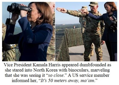 VFAUXTUS: Yes, honey. I can see the end zone from the 50 yard line also. She was at Observation Post Ouellette at Camp Bonifas in South Korea, which is apparently where they take all the politicians. At the link there are photos of Obama, Biden, and Clinton going “ooh ahh look I can see it” with the binocs, as well as photos of Trump, Pence, and Sanders scowling at the coiled razor wire the commies have strung across their border.