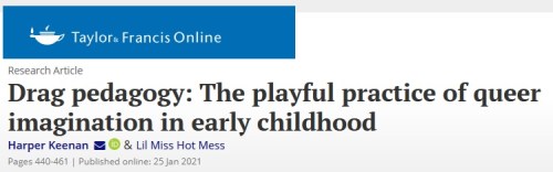 DRAG PEDAGOGY: The above allegedly scholarly article pretends to present an academic basis for exposing preschool children to men who dress up as women. The authors are an assistant professor of Gender & Sexuality Research in Education and Little Miss Hot Mess, a drag performer and board member for Drag Queen Story Hour, author of the children’s book The Hips on the Drag Queen Go Swish, Swish, Swish, and Ph.D. candidate in Media, Culture, and Communication.