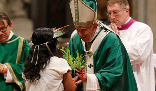 On Sunday, October 27, 2019, a representative of the indigenous people of Brazil carried a bowl containing dirt, plants, and red flowers in the offertory procession and presented it to Pope Francis who had it placed on the altar for the closing Mass of the Amazon Synod in St. Peter’s Basilica. It remained there throughout the consecration and was still there after all of the celebrants had left the church.