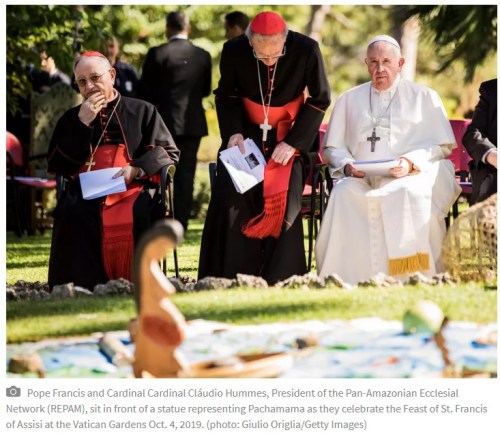 On October 4, 2019, the Catholic Feast of St. Francis of Assisi, Pope Francis hosted a pagan ceremony in the Vatican garden during which a priestess offered gifts and prayers to “Pachamama”, an Amazonian goddess who is not only still revered by the indigenous peoples of the Andes, but is considered by them to be higher than Jesus Himself. Pagan priests not only sacrifice animals to her, but also children.