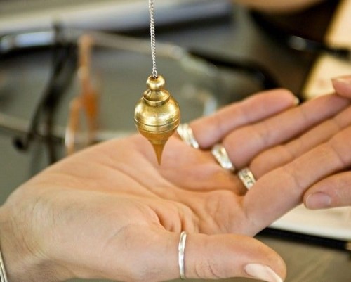 I asked what it was about and she showed me the object, which was a silver-colored metal plumb on a chain, similar to the one in the photo above. She said, “Dowsing. You hold it over the patient and ask a question. It swings one way for yes and the other way for no.“