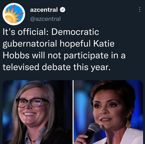 ARIZONA: The Democratic candidate candidate for governor, Katie Hobbs, has refused to debate the Republican candidate, Kari Lake. This is a wise decision. CLICK https://twitter.com/RNCResearch/status/1578959369265623040 [1:42] to see Hobbs uh fail to uh answer an uh simple uh question.