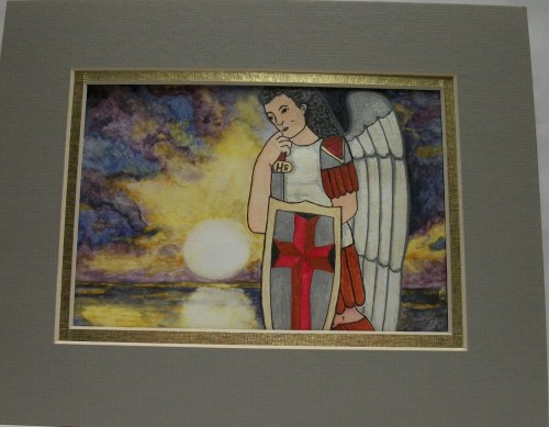 GRAMMY NOTES: This piece is about how the Eucharist blasts away the evil and darkness in the world. This angel is assigned as its watch carer, to protect and adore. I made him completely different, because angels are. The sky is painted with granulating water color paints, while the angel is drawn and painted with gouache, colored pencil, and liner pen.