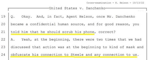 IGOR DANCHENKO: More revelations of Deep State corruption coming out of the Danchenko trial. It seems the FBI knew early on that Danchenko was the main person behind the anti-Trump lies in the Steele dossier, but since they were complicit in the Left’s anti-Trump efforts, they hid him from Nunnes’ and others’ inquiries into the Russiagate scam by making him a paid “confidential human source.” This week, we learned that putting him on the payroll also allowed them to legally instruct him to destroy evidence of their involvement.