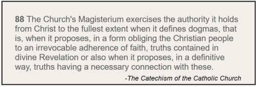 When the Catholic Church defines a truth as “dogma”, it proclaims that the stated Truth is a matter of Divine Revelation. Catholic dogmas are the most serious and solemn of all teachings, ones which Catholics are obliged to believe. They may not be specifically stated within Sacred Scripture – e.g., the word “Trinity” does not appear in the Bible – but they can never contradict Sacred Scripture.