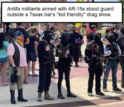 - https://thepostmillennial.com/breaking-heavily-armed-antifa-militants-stand-guard-outside-texas-kid-friendly-drag-show