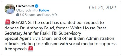 Naturally, neither the government nor Big Tech wants to disclose the damning evidence against themselves, but in September, Facebook’s Mark Zuckerberg admitted in a Joe Rogan interview that Facebook algorithmically censored the Hunter Biden Laptop for 7 days following a request from the FBI. Then, on Friday the court granted plaintiff’s request to depose a whole slew of bigwigs, including Tony Fauci and former WH Spox Jen Psaki.