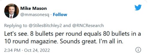 2A: CLICK https://twitter.com/RNCResearch/status/1584373507101986816 [:05] to hear FAUXTUS tell us, “My legislation says there can be no more than 8 bullets in a round.”
