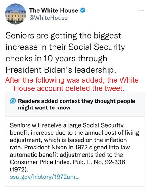 - https://www.foxnews.com/politics/white-house-deletes-tweet-flagged-twitter-credited-biden-social-security-payment-increase