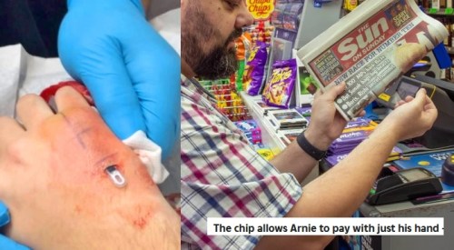 The chip tech, I figure, is not new, being no different than the chip in a credit card, or the way you can pay by waving your cell. The difference here is that the implant chip is more… handy. (Or, fore-heady?) It’s not mandatory… yet.
