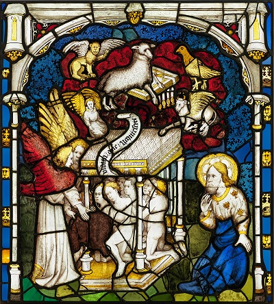Photo: Stained glass of the Opening of the Fifth Seal: “When he broke open the fifth seal, I saw underneath the altar the souls of those who had been slaughtered because of the witness they bore to the word of God. They cried out in a loud voice, ‘How long will it be, holy and true master, before you sit in judgment and avenge our blood on the inhabitants of the earth?’ Each of them was given a white robe, and they were told to be patient a little while longer until the number was filled of their fellow servants and brothers who were going to be killed as they had been.” – Rev 6:9-11