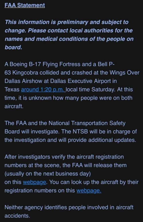 TRAGEDY: CLICK https://twitter.com/JasonWhitely/status/1591541681798668291 [:25] to see the mid-air collision of two planes during a Dallas air show.