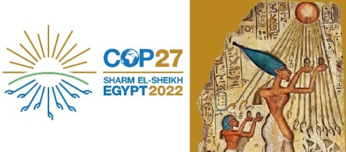 The 27th United Nations Conference of Parties on climate change (COP-27, November 6-18, 2022) has been happening this week in Egypt’s Sinai Peninsula. The focus this year has been on getting world religions and world religious leaders on board the climate church train. I doubt very much that it’s an accident that the COP-27 logo is derived from the Egyptian symbol for Aten, the sun god, in which the sun’s rays emanate from the sun disk and terminate in human hands.