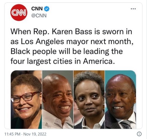 RACISM: America is so raaacist that the four largest cities all have Black mayors. Sadly, since they’re also Democrats, they’re doing nothing at all to improve the lives of their Black constituents.