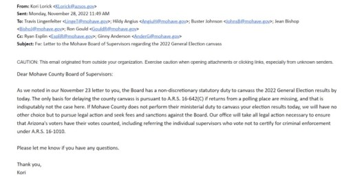 ARIZONA: Y’all will remember that Democratic Secretary of State Katie Hobbs refused to recuse herself from overseeing the election, despite the fact that she was a gubernatorial candidate running in a close race. Now it seems her office actually threatened Mohave County Supervisors with arrest and prosecution if they failed to certify that Hobbs won! Never mind that these people have serious concerns about election irregularities and want answers about what actually happened before handing the governor’s office to someone who may be a cheating cheater.