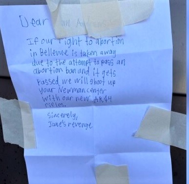 ABORTION ACTIVISM: Jane’s Revenge left this note on the oratory door of the St. John Paul II Newman Center at the University of Nebraska Omaha (UNO).