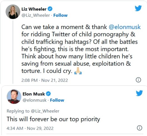 Musk responded, “No, it is not. When Ella Irwin, who now runs Trust & Safety, joined Twitter earlier this year, almost no one was working on child safety. She raised this with Ned & Parag, but they rejected her staffing request. I made it top priority immediately.”