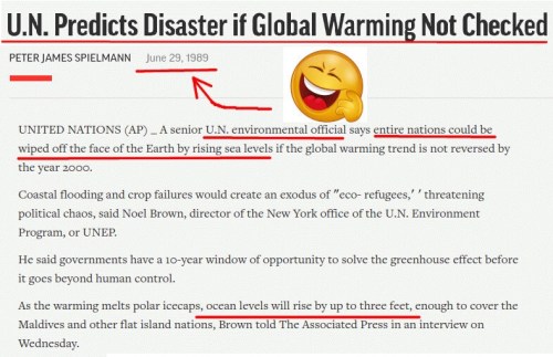 Twenty-two years ago, they told us that entire nations could be wiped off the face of the Earth by rising sea levels if the global warming trend was not reversed by the year 2000.
