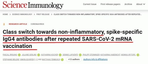 VAXXX: It appears that the mRNA shots are triggering the wrong kind of immune response in those vulnerable sheeple who keep rolling up their sleeves. With each subsequent shot, their bodies make less “seek out and destroy” (IgG3) antibodies for the ‘rona virus and more “ignore this stuff” (IgG4) antibodies. And it appears that, the more often a person is boosted, the greater the shift from IgG3 to IgG4 becomes.