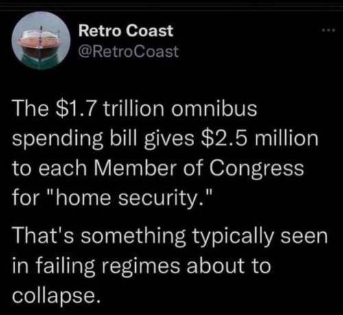 FAILING REGIME: When Elon Musk bought Twitter, he described the previous year’s losses ($44 billion) as akin to a “plane that is headed toward the ground at high speed with the engines on fire and the controls don’t work.” Kinda reminds me of the federal government.