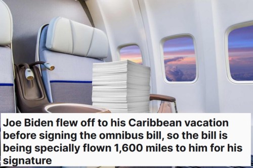 - https://notthebee.com/article/joe-biden-flew-off-to-his-caribbean-vacation-before-signing-the-omnibus-bill-so-the-bill-is-being-specially-flown-to-him-for-his-signature