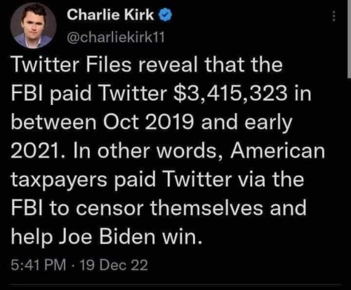 FBI: Musk’s latest Twitter file releases have revealed that the intelligence community pushed Twitter to find some sort of coordinated Russian disinformation campaign on which it could blame things like the Hunter Biden laptop story and the Wuhan lab leak story.
