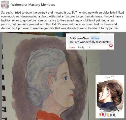 GRAMMY NOTES: In November, Mama Buzz and Dearest got me a year’s subscription to Watercolor Mastery with Emily Olson, a gifted watercolorist and teacher. A couple of days ago, I posted to her FB group the painting above that I did while watching one of her tutorials, plus an explanation for why it wasn’t like the reference. Emily has never commented on any of my pieces before, but with this one, I got a very nice gold-star slash pat-on-the-head. I’m so chuffed! 🙂