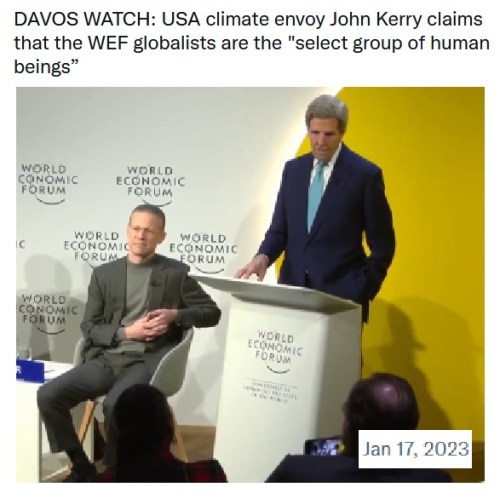 CLICK https://twitter.com/DrewHLive/status/1615316501275480067 [:39] to hear John Kerry’s arrogant praise for himself and the other pompous buttheads at the WEF. Good comments on this clip: “And they say Trump is a narcissist” and “Modern gnosticism.”