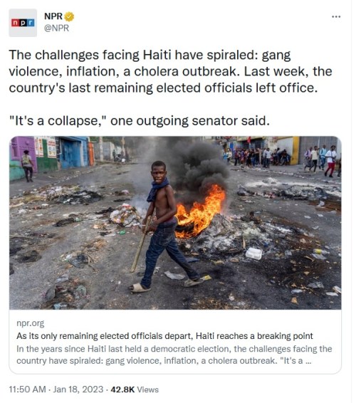 HAITI: After years of canceled elections, Haiti now has no federal government at all. Its Senate is supposed to have 30 members; the last ten finished their terms recently and left. Its lower legislative chamber should have 119; there are none. And the last president was assassinated in 2021.