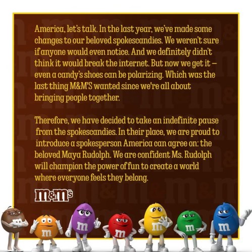 GET WOKE, GO BROKE: M&Ms tried to make their candies “relevant” and got roundly mocked for it. Oh, and also sales dropped. Skittles responded to the announcement (graphic) with, “Our thoughts go out to the spokescandies.”