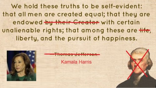 She then followed up by denying the Creator’s role, saying, “Be clear. These rights were not bestowed upon us. They belong to us as Americans.”
