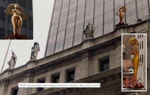 NYC: A demon now stands proudly atop the courthouse of the Appellate Division of the New York State Supreme Court alongside famous law makers. The sculptor calls it “NOW” and says it’s meant to channel Ruth Bader Ginsburg and her fight to keep abortion legal. The only good thing in this story is that the statue will be moved to Houston in June.