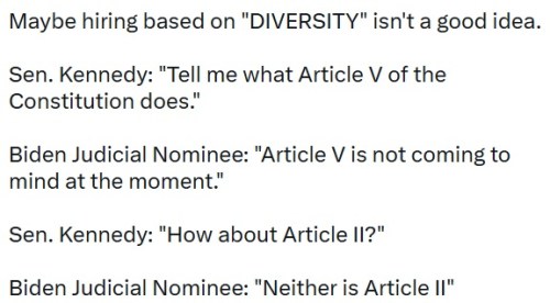 CLICK https://twitter.com/ColumbiaBugle/status/1618648781180010498 [1:20] to hear how, during her congressional hearing, she was not able to identify articles of the Constitution or define “purposivism.”