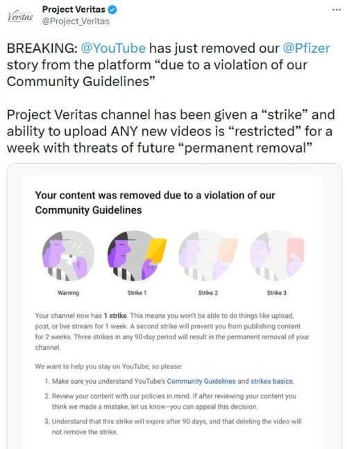 PROJECT VERITAS: Witness the power of Big Pharma … YouTube caved to pressure from the COVID-ELITES and removed the PV undercover video in which an exec said they are manipulating the virus on purpose. (Pfizer says they don’t.) The video is still available @ https://www.projectveritas.com/ AND @ https://twitter.com/JamesOKeefeIII/status/1619128293684580352 AND @ https://rumble.com/v274lsi-pfizer-exposed-for-exploring-mutating-covid-19-virus-for-new-vaccines-via-d.html.
