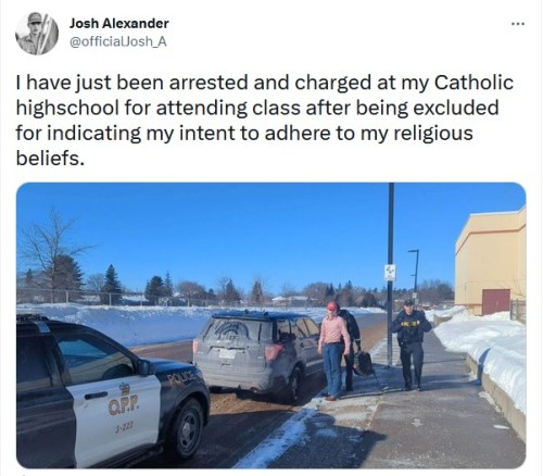 His attorney, James Kitchen, the chief litigator for Liberty Coalition Canada (LCC), said, “Did we know he might get arrested? Well, of course we did. … “Today was not entirely unforeseen. If they’re [the school] going to continue to double down and enforce that discrimination, yes, they’re going to arrest him.”