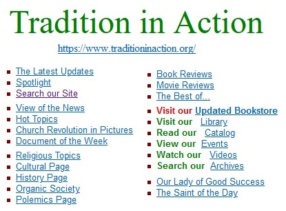 Tradition in Action: “TIA defends the Catholic Church and fights for the restoration of a Christian Civilization.” Their website @ https://www.traditioninaction.org/. Like the rest, they offer articles, books, book and movie reviews, etc. They don’t like The Chosen, so :-P“““ from me!