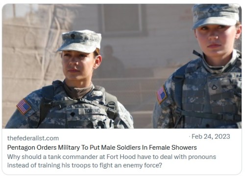 - https://thefederalist.com/2023/02/24/biden-pentagon-orders-military-chaplains-to-bless-putting-male-soldiers-in-female-showers-and-bedrooms/