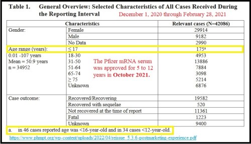 During this period. there was neither authorization nor pediatric dose information for 5-to-12s, much less even younger kids. Yet the report lists 34 Adverse Events for under 12s. Of the 34 cases, 132 Adverse Events were reported. Of these, 24 of the kids’ problems (71%) were classified as serious. And some of the kids were under 5.