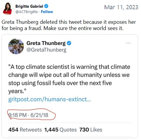 - https://www.lifesitenews.com/news/greta-thunberg-deletes-2018-tweet-warning-humans-will-go-extinct-if-climate-isnt-fixed-by-2023/