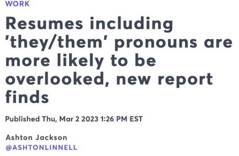HR: CLICK https://twitter.com/itsNTBmedia/status/1635747671632691200 to hear what we are all thinking said out loud. Her comments are in response to a survey done by business.com that compared responses to resumes with and without they/them pronouns. He/him and she/her were not tested, but I’d be surprised if they didn’t also show some employer bias.