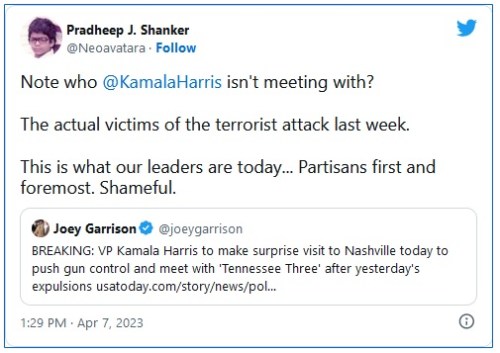 - https://notthebee.com/article/kamala-harris-is-making-a-surprise-visit-to-nashville-to-see-the-tennessee-three-and-no-thats-not-referring-to-the-the-families-of-the-three-children-killed-in-a-school-shooting-last-week
