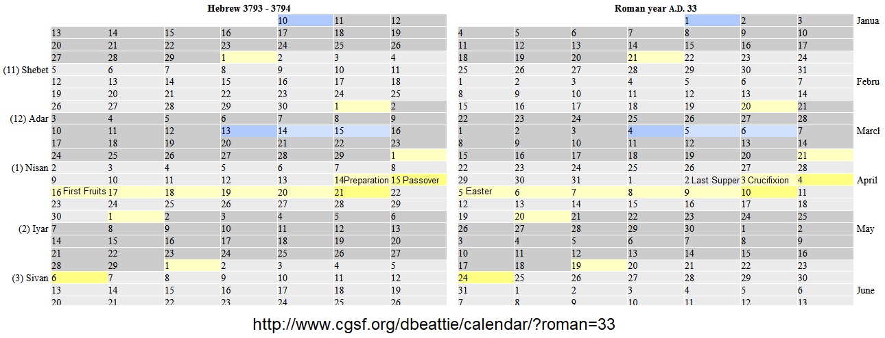 Clearly, any year that doesn’t match these week days is the wrong year. And, as you can see on this calendar, 33 AD is a perfect fit. Traditionally, the year of Jesus’ Passion has been set in 33 AD. And, as you can see on this calendar, the weekdays fit perfectly.