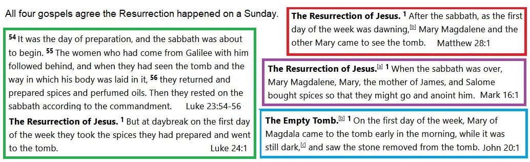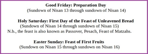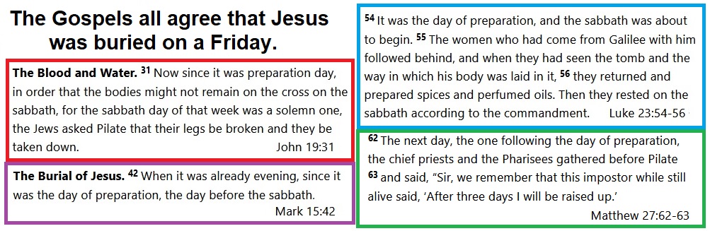 If Jesus was truly an historical figure, a man who lived and died in a certain place and time, then we should be able to find important dates in His life on the calendar. And what more important date was there than the day He died? All four Gospels agree that Jesus was crucified and buried on a Friday, lay in His tomb on a Saturday, and rose on a Sunday morning. CLICK graphics to embiggen for easier viewing.