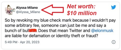 TWITTER: Musk has instituted an $8/month fee to display the “verified identity” blue check mark on your account. Multi-millionaire celebs are up in arms about this infringement on their “right” to “free” speech. I wonder how many of them pay big bucks for bodyguards and VPN and every other kind of security feature known to man? It’s clearly not about the eight bucks. It’s about Musk.